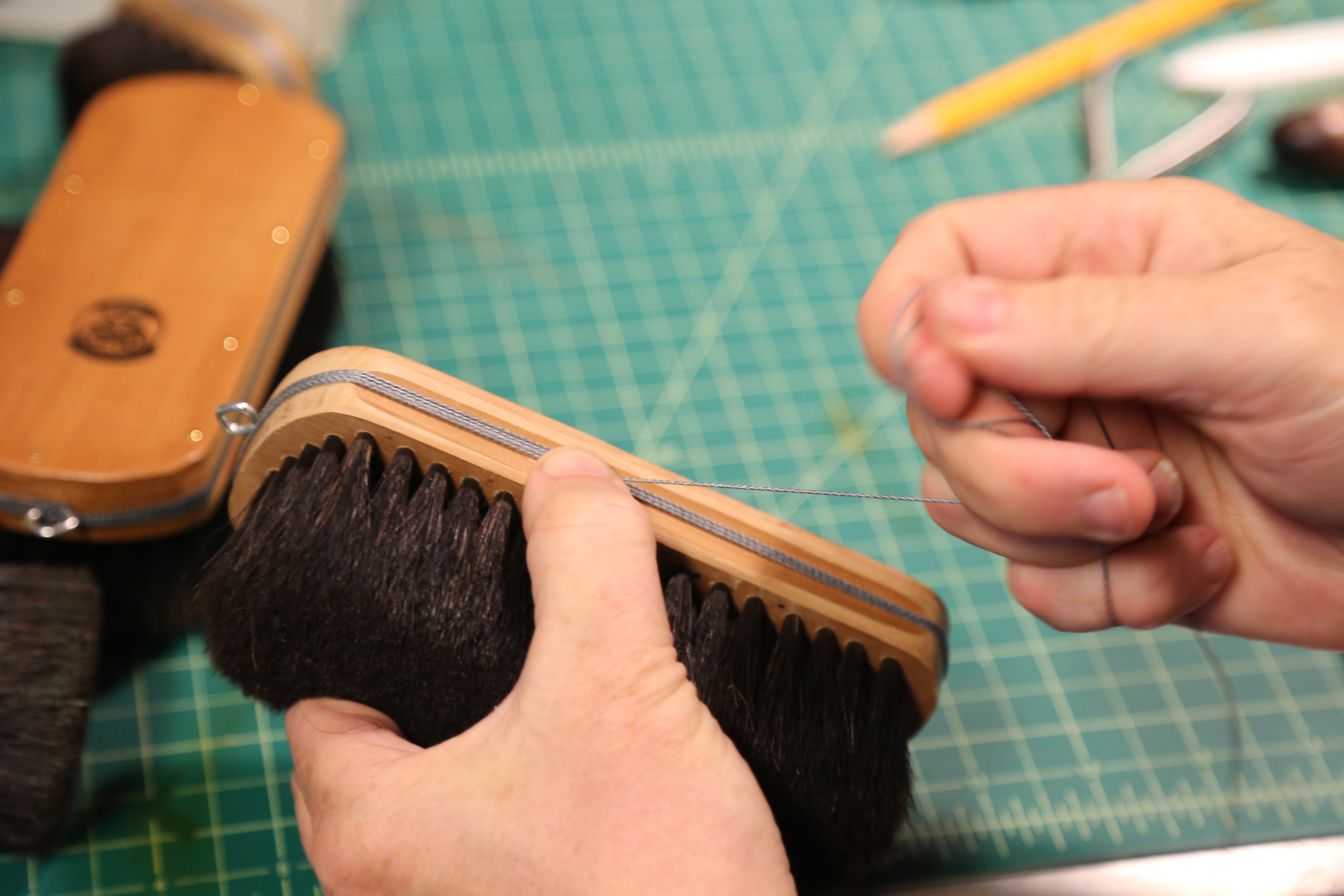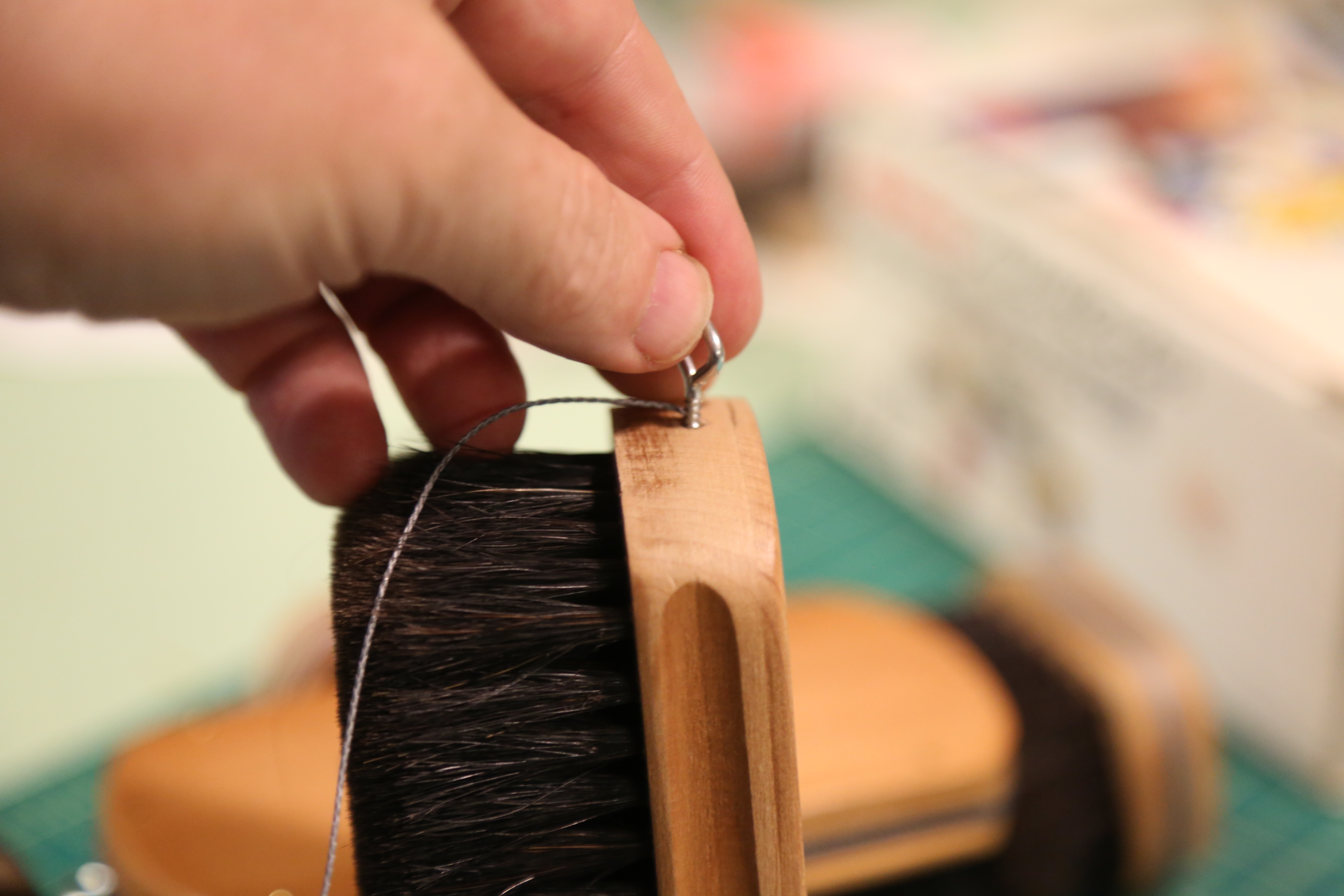 Wrap the twine 5-7 times around the brush as tight as you can. The groves on both sides of the brush helps to keep the twine stable.